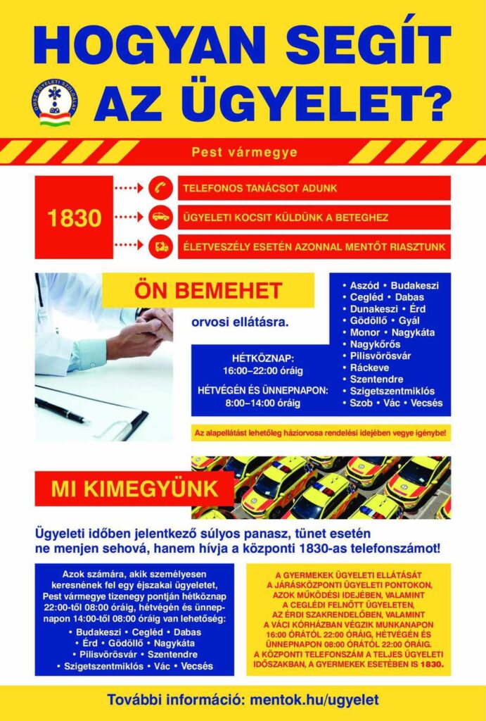 Fontos tehát, hogy VÁLTOZIK az ügyelet telefonszáma, és 2024. február 1-jétől az 1830 -as telefonszámot kell tárcsázni. Itt a mentőszolgálat képzett munkatársa kikérdezi a telefonálót, és a kapott információ alapján vagy telefonos tanáccsal segít, vagy ha az esetet súlyosnak ítéli meg, akkor ügyeletes ellátót küld a beteghez, sürgős esetben pedig mentőautót.